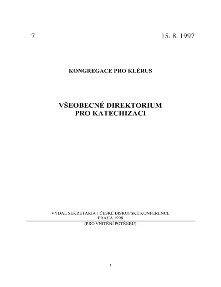 7 15. 8. 1997 KONGREGACE PRO KLÉRUS VŠEOBECNÉ DIREKTORIUM PRO KATECHIZACI VYDAL SEKRETARIÁT ČESKÉ BISKUPSKÉ KONFERENCE PRAHA 1998 (PRO VNITŘNÍ POTŘEBU) 1 ZKRATKY CÍRKEVNÍCH DOKUMENTŮ AA: DRUHÝ VATIKÁNSKÝ KONCIL, Dekret o apoštolátu laiků Apostolicam actuositatem (18. listopadu 1965), Zvon, Praha 1995 AG: DRUHÝ VATIKÁNSKÝ KONCIL, Dekret o misijní činnosti církve Ad gentes (7. prosince 1965), Zvon, Praha 1995 CA: JAN PAVEL II., Encyklika Centesimus annus (1. května 1991), Zvon, Praha 1991 CCL: Corpus christianorum, Series Latina (Turnholti 1953) ChL: JAN PAVEL II., Posynodní apoštolský list Christifideles laici (30. prosince 1988), Zvon, Praha 1990 CIC: Kodex kanonického práva, Zvon, Praha 1994 COINCAT: CONSIGLIO INTERNAZIONALE PER LA CATECHESI, Orientamenti, La catechesi degli adulti nella comunità cristiana, LEV 1990 CSEL: Corpus Scriptorum Ecclesiasticorum Latinorum (Wn 1866 ss.) CT: JAN PAVEL II., Apoštolská exhortace Catechesi tradendae, (16. října 1979) DH: DRUHÝ VATIKÁNSKÝ KONCIL, Deklarace o náboženské svobodě Dignitatis humanae (7. prosince 1965), Zvon, Praha 1995 DM: JAN PAVEL II., Encyklika Dives in misericordia (30. listopadu 1980), Zvon, Praha 1995 DV: DRUHÝ VATIKÁNSKÝ KONCIL, Věroučná konstituce o Božím zjevení Dei Verbum (18. listopadu 1965), Zvon, Praha 1995 DS: H. DENZINGER - A. SCHÖNMETZER, Enchiridion Symbolorum Definitionum et Declarationum de Rebus Fidei et Morum, Editio XXXV emendata, Romae 1973 EA: JAN PAVEL II., Posynodní apoštolská exhortace Ecclesia in Africa (14. srpna 1995) EN: PAVEL VI., Apoštolská exhortace Evangelii nuntiandi (8. prosince 1975), Zvon, Praha 1990 EV: JAN PAVEL II., Encyklika Evangelium vitae (25. března 1995), Zvon, Praha 1995 FC: JAN PAVEL II., Apoštolská adhortace Familiaris consortio (22. listopadu 1981), Zvon, Praha 1992 FD: JAN PAVEL II., Apoštolská konstituce Fidei depositum (11. října 1992), Zvon, Praha 1995 (přiřazena u KKC) GCM: KONGREGACE PRO EVANGELIZACI NÁRODŮ, Guida per i catechisti /Průvodce pro katechety/ (3. prosince 1993), Città del Vaticano 1993 GE: DRUHÝ VATIKÁNSKÝ KONCIL, Deklarace o křesťanské výchově Gravissimum educationis (28. října 1965), Zvon, Praha 1995 GS: DRUHÝ VATIKÁNSKÝ KONCIL, Pastorální konstituce o církvi v dnešním světě Gaudium et spes (7. prosince 1965), Zvon, Praha 1995 KKC: Katechismus katolické církve (11. října 1992), Zvon, Praha 1995 LC: KONGREGACE PRO NAUKU VÍRY, Instrukce Libertatis Conscientia (22. března 1986), AAS 79 (1987), s. 554-599 LE: JAN PAVEL II., Encyklika Laborem exercens (14. září 1981), Zvon, Praha 1991 LG: DRUHÝ VATIKÁNSKÝ KONCIL, Věroučná konstituce o církvi Lumen gentium (21. listopadu 1964), Zvon, Praha 1995 MM: JAN XXIII., Encyklika Mater et Magistra (15. května 1961), Zvon, Praha 1996 MPD: SYNODA BISKUPŮ, Messaggio al Popolo di Dio Cum iam ad exitum sulla catechesi nel nostro tempo (28. října 1977), Typis Polyglottis Vaticanis 1977 2 NA: DRUHÝ VATIKÁNSKÝ KONCIL, Deklarace o poměru církve k nekřesťanským náboženstvím Nostra aetate (28. října 1965), Zvon, Praha 1995 PB: JAN PAVEL II., Apoštolská konstituce Pastor bonus (28. června 1988) PG: Patrologiae Cursus completus, Series Graeca, ed. Jacques-P.Migne, Parisiis 1857 ss. PL: Patrologiae Cursus completus, Series Latina, ed. Jacques-P.Migne, Parisiis 1844 ss. PO: DRUHÝ VATIKÁNSKÝ KONCIL, Dekret o službě a životě kněží Presbyterorum ordinis (7. prosince 1965), Zvon, Praha 1995 PP: PAVEL VI., Encyklika Populorum progressio (26. března 1967), Zvon, Praha 1996 RH: JAN PAVEL II., Encyklika Redemptor hominis (4. března 1979) RICA: Rito dell´Iniziazione Cristiana degli Adulti, (Città del Vaticano, 1972), český překlad Obřady uvedení do křesťanského života, kapitola „Uvedení do křesťanského života dospělých“, Liturgická komise, 1972) RM: JAN PAVEL II., Encyklika Redemptoris Missio (7. prosince 1990), Zvon, Praha 1994 SC: DRUHÝ VATIKÁNSKÝ KONCIL, Konstituce o posvátné liturgii „Sacrosanctum Concilium“ (4. prosince 1963), Zvon, Praha 1995 SINODO 1985: SYNODA BISKUPŮ (mimořádné shromáždění 1985), Závěrečný dokument „Ecclesia sub verbo Dei mysteria Christi celebrans pro salute mundi“ (7. prosince 1985), Città del Vaticano 1985 Sch: Sources Chrétiennes, Collection Paris 1946 ss. SRS: JAN PAVEL II., Encyklika Sollicitudo rei socialis (30. prosince 1987), Zvon, Praha 1996 TMA: JAN PAVEL II., Apoštolský list Tertio millennio adveniente (10. listopadu 1994), Zvon, Praha 1995 UR: DRUHÝ VATIKÁNSKÝ KONCIL, Dekret o ekumenismu Unitatis redintegratio (21. listopadu 1964), Zvon, Praha 1995 UUS: JAN PAVEL II., Encyklika Ut unum sint (25. května 1995), Zvon, Praha 1995 VKD: KONGREGACE PRO KLÉRUS, Direttorio catechistico generale /Všeobecné katechetické direktorium/ Ad normam decreti (11. dubna 1971), AAS 64 (1972), s. 97176 VS: JAN PAVEL II., Encyklika Veritatis splendor (6. srpna 1993), Zvon, Praha 1994 3 PŘEDMLUVA 1. Druhý vatikánský koncil rozhodl, aby bylo vypracováno „Direktorium pro katechizaci křesťanského lidu“.1 Kongregace pro klérus použila ke splnění tohoto úkolu služby zvláštní komise odborníků a konzultovala biskupské konference, které zpětně poskytly mnoho návrhů a podnětů. Vzniklý text pak přehlédla teologická komise ustanovená ad hoc a Kongregace pro nauku víry. 18. března 1971 ho s konečnou platností schválil Pavel VI. a 11. dubna téhož roku byl vydán pod názvem Všeobecné katechetické direktorium. 2. Doba třiceti let od skončení Druhého vatikánského koncilu na prahu třetího tisíciletí je nepochybně dobou velmi vhodnou k usměrnění a dalšímu rozvoji katechetické práce. Bylo to období, které jistým způsobem znovu ukázalo evangelizační vitalitu prvotní církve, znovu se obrátilo k učení církevních Otců a podpořilo moudrý návrat k původnímu katechumenátu. Od roku 197