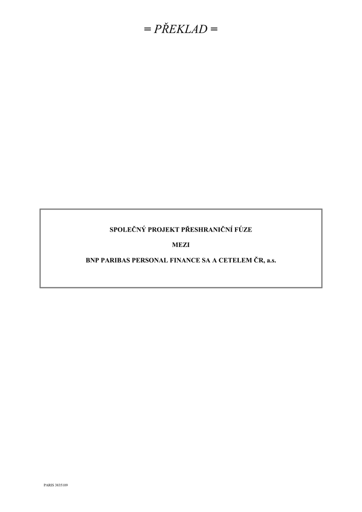 = PŘEKLAD = SPOLEČNÝ PROJEKT PŘESHRANIČNÍ FÚZE MEZI BNP PARIBAS PERSONAL FINANCE SA A CETELEM ČR, a.s. PARIS 3835109 Obsah 1 Definice ...................................................................................................................................... 7 2 2.1 2.2 2.3 2.4 2.5 2.6 2.7 Označení a ocenění majetku a závazků převáděných na nástupnickou společnost .................... 7 Vložený majetek (účetní hodnota podle stavu k 31. prosinci 2013)........................................... 8 Vložené závazky (účetní hodnota podle stavu k 31. prosinci 2013) .......................................... 8 Převedený čistý majetek ............................................................................................................. 9 Výnos z Fúze (boni de fusion) .................................................................................................... 9 Podrozvahové závazky ............................................................................................................... 9 Úplata za převod ......................................................................................................................... 9 Absence prémie za fúzi............................................................................................................. 10 3 3.1 3.2 3.3 3.4 Odkládací podmínky a den účinnosti Fúze ............................................................................... 10 Odkládací podmínky................................................................................................................. 10 Den účinnosti – Podmíněný zpětný účinek pro daňové a účetní účely .................................... 10 Převod veškerého majetku a závazků ....................................................................................... 10 Zanikající společnost bude zrušena bez likvidace .................................................................... 10 4 4.1 4.2 Podmínky fúze .......................................................................................................................... 11 Všeobecné podmínky ............................................................................................................... 11 Specifická ustanovení ohledně dohod mezi Nástupnickou společností a Zanikající společností ................................................................................................................................ 11 Specifická pracovněprávní ustanovení ..................................................................................... 12 Právo věřitelů, kteří nejsou majiteli dluhopisů, na vznášení námitek ...................................... 12 Práva, která udělí Nástupnická společnost majitelům dluhopisů ............................................. 12 Výhody pro členy představenstva nebo jiné členy správních, řídících, dozorčích či kontrolních orgánů zúčastněných společností .......................................................................... 13 Prohlášení a ujištění Zanikající společnosti.............................................................................. 13 Prohlášení a ujištění Nástupnické společnosti .......................................................................... 13 4.3 4.4 4.5 4.6 4.7 4.8 5.2 5.3 5.4 5.5 5.6 Daňový režim ........................................................................................................................... 13 Obecná ustanovení.................................................................................................................... 13 5.1.1 Den účinnosti Fúze pro účely daní .............................................................................. 13 5.1.2 Záznamy do účetních knih....................................... Chyba! Záložka není definována. 5.1.3 General representation undertaking ............................................................................. 14 Daň z příjmů právnických osob ................................................................................................ 14 Daň z přidané hodnoty.............................................................................................................. 15 Registrační poplatky ................................................................................................................. 16 Předchozí transakce .................................................................................................................. 16 Celková subrogace.................................................................................................................... 16 6 6.1 6.2 6.3 6.4 6.5 6.6 6.7 6.8 Různá ustanovení...................................................................................................................... 16 Částečná neplatnost .................................................................................................................. 16 Podání a formální požadavky ................................................................................................... 16 Výdaje....................................................................................................................................... 16 Plná moc ................................................................................................................................... 16 Adresy pro doručování ............................................................................................................. 17 Jazyky ....................................................................................................................................... 17 Rozhodné právo, soudní příslušnost ......................................................................................... 17 Preambule, názvy článků a přílohy.......................