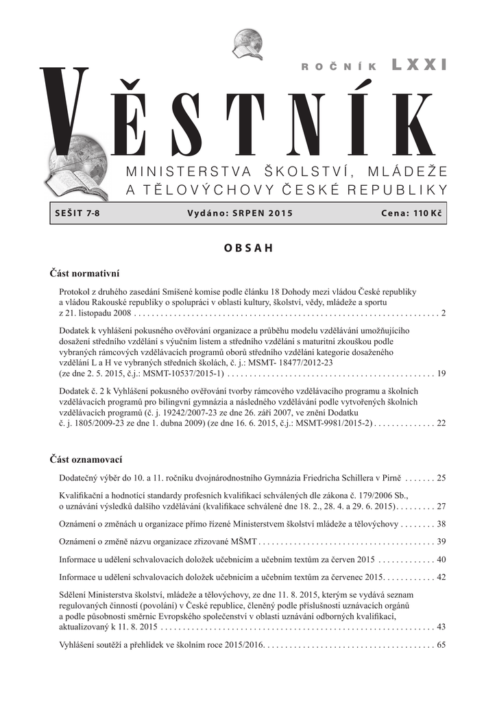 Věstník r o č n í k LXXI M I N I S T E R S T VA Š K O L S T V Í , M L Á D E Ž E A T Ě L O V Ý C H O V Y Č E S K É R E P U B L I K Y S E Š I T 7-8 Vydáno: SRPEN 2015 C e n a : 110 K č OBSAH Část normativní Protokol z druhého zasedání Smíšené komise podle článku 18 Dohody mezi vládou České republiky a vládou Rakouské republiky o spolupráci v oblasti kultury, školství, vědy, mládeže a sportu z 21. listopadu 2008. . . . . . . . . . . . . . . . . . . . . . . . . . . . . . . . . . . . . . . . . . . . . . . . . . . . . . . . . . . . . . . . . . . . . . 2 Dodatek k vyhlášení pokusného ověřování organizace a průběhu modelu vzdělávání umožňujícího dosažení středního vzdělání s výučním listem a středního vzdělání s maturitní zkouškou podle vybraných rámcových vzdělávacích programů oborů středního vzdělání kategorie dosaženého vzdělání L a H ve vybraných středních školách, č. j.: MSMT- 18477/2012-23 (ze dne 2. 5. 2015, č.j.: MSMT-10537/2015-1) . . . . . . . . . . . . . . . . . . . . . . . . . . . . . . . . . . . . . . . . . . . . . . . . 19 Dodatek č. 2 k Vyhlášení pokusného ověřování tvorby rámcového vzdělávacího programu a školních vzdělávacích programů pro bilingvní gymnázia a následného vzdělávání podle vytvořených školních vzdělávacích programů (č. j. 19242/2007-23 ze dne 26. září 2007, ve znění Dodatku č. j. 1805/2009-23 ze dne 1. dubna 2009) (ze dne 16. 6. 2015, č.j.: MSMT-9981/2015-2). . . . . . . . . . . . . . . 22 Část oznamovací Dodatečný výběr do 10. a 11. ročníku dvojnárodnostního Gymnázia Friedricha Schillera v Pirně . . . . . . . . 25 Kvalifikační a hodnotící standardy profesních kvalifikací schválených dle zákona č. 179/2006 Sb., o uznávání výsledků dalšího vzdělávání (kvalifikace schválené dne 18. 2., 28. 4. a 29. 6. 2015). . . . . . . . . . 27 Oznámení o změnách u organizace přímo řízené Ministerstvem školství mládeže a tělovýchovy. . . . . . . . . 38 Oznámení o změně názvu organizace zřizované MŠMT. . . . . . . . . . . . . . . . . . . . . . . . . . . . . . . . . . . . . . . . . 39 Informace u udělení schvalovacích doložek učebnicím a učebním textům za červen 2015 . . . . . . . . . . . . . . 40 Informace u udělení schvalovacích doložek učebnicím a učebním textům za červenec 2015. . . . . . . . . . . . . 42 Sdělení Ministerstva školství, mládeže a tělovýchovy, ze dne 11. 8. 2015, kterým se vydává seznam regulovaných činností (povolání) v České republice, členěný podle příslušnosti uznávacích orgánů a podle působnosti směrnic Evropského společenství v oblasti uznávání odborných kvalifikací, aktualizovaný k 11. 8. 2015 . . . . . . . . . . . . . . . . . . . . . . . . . . . . . . . . . . . . . . . . . . . . . . . . . . . . . . . . . . . . . . . 43 Vyhlášení soutěží a přehlídek ve školním roce 2015/2016. . . . . . . . . . . . . . . . . . . . . . . . . . . . . . . . . . . . . . . . 65 strana 2 SEŠIT 7-8 Č Á S T N O R M AT I V N Í Protokol z druhého zasedání Smíšené komise podle článku 18 Dohody mezi vládou České republiky a vládou Rakouské republiky o spolupráci v oblasti kultury, školství, vědy, mládeže a sportu z 21. listopadu 2008 Druhé zasedání Smíšené komise podle článku 18 Dohody mezi vládou České republiky a vládou Rakouské republiky o spolupráci v oblasti kultury, školství, vědy, mládeže a sportu z 21. listopadu 2008 se konalo v Praze dne 30. června 2015. Tohoto zasedání se zúčastnili členové delegace uvedení v příloze A. Obě strany zpracovaly pracovní program spolupráce na léta 2015 až 2019, jehož přílohou je pracovní program programu Akce Česká republika - Rakouská republika - spolupráce ve vědě a vzdělávání pro 6. etapu (příloha B). Oba pracovní programy jsou platné do 31. prosince 2019. Pokud nebude k tomuto termínu přijat nový pracovní program, prodlužuje se platnost pracovního programu až do doby vstupu v platnost nového pracovního programu, nejdéle však do 31. prosince 2022. PRACOVNÍ PROGRAM SPOLUPRÁCE ČESKÁ REPUBLIKA - RAKOUSKÁ REPUBLIKA I. VYSOKÉ ŠKOLSTVÍ, VĚDA, VÝZKUM A INOVACE 1. Vědecko-technická spolupráce Obě strany vítají další pokračování úspěšné spolupráce v rámci vědecko-technické kooperace, která je na české straně koordinována Ministerstvem školství, mládeže a tělovýchovy a na rakouské straně Spolkovým ministerstvem pro vědu, výzkum a hospodářství v rámci společné pracovní skupiny pro vědecko-technickou spoluprá ci. 2a) Obě strany vítají rozšíření přímé spolupráce českých a rakouských vysokých škol a univerzit v oblasti společných studijních programů (double-degree). 2b) Obě strany vítají rozšíření přímé spolupráce mezi Akademií věd České republiky a Rakouskou akademií věd . 2. Spolupráce v oblasti vědy, výzkumu a inovací Obě strany vítají rozšíření přímé spolupráce výzkumných institucí obou zemí. SEŠIT 7-8 strana 3 3. Univerzitní konference / Konference rektorů Obě strany vysoce hodnotí přímé kontakty mezi Českou konferencí rektorů a Rakouskou konferencí rektorů, jakož i dobrou spolupráci na evropské úrovni v rámci Evropské univerzitní asociace (EUA) a „Dunajské konference rektorů". 4. Program Akce Česká republika - Rakouská republika Vztahy v oblasti vědy mezi Českou republikou a Rakouskou republikou se neobyčejně rozšířily a zintenzivnily díky programu „Akce Česká republika - Rakouská republika spolupráce ve vědě a vzdělávání". Dne 31. 12. 2015 bude ukončena jeho pátá etapa. Obě strany mají zájem na pokračování programu Akce po dobu platnosti tohoto pracovního programu. Pracovní program pro šestou etapu je obsažen v příloze B. 5. Programy a 