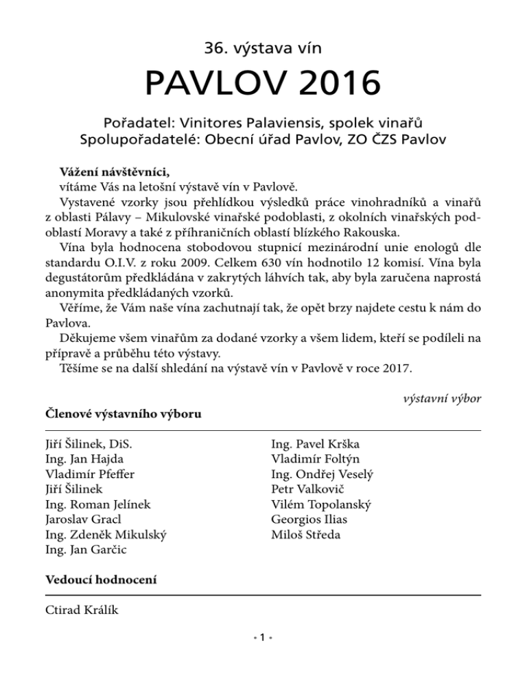 36. výstava vín PAVLOV 2016 Pořadatel: Vinitores Palaviensis, spolek vinařů Spolupořadatelé: Obecní úřad Pavlov, ZO ČZS Pavlov Vážení návštěvníci, vítáme Vás na letošní výstavě vín v Pavlově. Vystavené vzorky jsou přehlídkou výsledků práce vinohradníků a vinařů z oblasti Pálavy – Mikulovské vinařské podoblasti, z okolních vinařských podoblastí Moravy a také z příhraničních oblastí blízkého Rakouska. Vína byla hodnocena stobodovou stupnicí mezinárodní unie enologů dle standardu O.I.V. z roku 2009. Celkem 630 vín hodnotilo 12 komisí. Vína byla degustátorům předkládána v zakrytých láhvích tak, aby byla zaručena naprostá anonymita předkládaných vzorků. Věříme, že Vám naše vína zachutnají tak, že opět brzy najdete cestu k nám do Pavlova. Děkujeme všem vinařům za dodané vzorky a všem lidem, kteří se podíleli na přípravě a průběhu této výstavy. Těšíme se na další shledání na výstavě vín v Pavlově v roce 2017. výstavní výbor Členové výstavního výboru Jiří Šilinek, DiS. Ing. Pavel Krška Ing. Jan Hajda Vladimír Foltýn Vladimír Pfeffer Ing. Ondřej Veselý Jiří ŠilinekPetr Valkovič Ing. Roman Jelínek Vilém Topolanský Jaroslav GraclGeorgios Ilias Ing. Zdeněk Mikulský Miloš Středa Ing. Jan Garčic Vedoucí hodnocení Ctirad Králík •1 • CHAMPIONI a zvláštní ceny CHAMPION bílých vín Vz. č. 391, Pálava,Vinařství Garčic, Pavlov,VH, 2015 CHAMPION červených vín Vz. 642, Merlot No. 12, 2007, Woditschka Rudi, Herrnbaumgarten (AT), dovozce Z. Marouš, Valtice ZVLÁŠTNÍ CENA ZA NEJLEPŠÍ RŮŽOVÉ VÍNO Vz. 503, Merlot – Rosé, Stanišis Thomas, Pavlov (Bratrstvo Modrého Kamene), PS, 2015 ZVLÁŠTNÍ CENA SENÁTORA ING. J. HAJDY ZA NEJLEPŠÍ PAVLOVSKÝ RYZLINK VLAŠSKÝ Vz. 25, Ryzlink vlašský, Vinařství Nepraš & Co., s.r.o., Pavlov, PS, 2015 Vz. 78, Ryzlink vlašský, Vinařství Garčic, Pavlov, PS, 2015 NEJLEPŠÍ KOLEKCE Woditschka Rudi, Herrnbaumgarten (AT), dovozce Z. Marouš, Valtice •2 • č. vz. jméno, bydliště přívl. ročník body dipl. poznámky Cuvée/ Směs bílá 1 2 3 4 5 6 7 8 9 10 11 12 13 Vinařství Nepraš & Co.,s.r.o., Pavlov / Savrie PS Konečný Josef, Čejkovice / Malv./Aurelius VH Vinařství Šilinek Jiří, Pavlov / C. Boží muka kab. Rampáček Milan, Klentnice Brychta Stanislav, Křepice / VZ + MT Střední vinařská škola Valtice / VZ + TČ kab. Vinařství Garčic, Pavlov / NB + SVG PS Víno Valadia, Perná / Cha + VZ kab. Vinařství Svoboda, D. Věstonice / VZ + RV Zatloukal Milan, Pavlov / RB + RŠ Popela Stanislav, Perná / Cuvée Vers PS Topolanský Vilém, Pavlov / Pa + SVG PS Šnajdr Miroslav, Ratíškovice / SG + Hib + RB PS 2014 2015 2015 2015 2015 2015 2015 2015 2015 2013 2015 2015 2015 80,0 80,0 86,0 83,0 86,0 87,0 83,0 80,0 75,0 82,0 89,0 83,0 77,0 ZM SM ZM ZM SM ZM Vítěz kateg. SM R yzlink vlašský 16 17 18 19 20 21 22 23 24 25 26 27 28 29 30 31 32 33 34 35 36 37 38 39 40 41 42 43 44 45 46 47 48 49 Dvořák Tomáš, Krnčice PS Vinařství Nepraš & Co.,s.r.o., Pavlov Peřina Stanislav, Perná PS Vinařství Nepraš & Co.,s.r.o., Pavlov kab. Vinařství Šabata, Zaječí PS Kabela Jan, Pavlov PS Vinařství Nepraš & Co.,s.r.o., Pavlov kab. Vinařství Langr, D. Věstonice Vinofol Novosedly PS Vinařství Nepraš & Co.,s.r.o., Pavlov PS Vinařství Žůrek, Žeravice PS Vinařství Bačovská, Perná PS Ilias Jiří, ml., Brno kab. Fiala Tomáš, Břeclav PS Volařík Miroslav, D. Dunajovice PS Vinařství Šilinek Jiří, Pavlov PS Hajda Jan, Pavlov PS Moravčíkova vína, H. Věstonice PS Vyskočil Tomáš, Strachotín Talaš Miroslav, Milovice PS Woditschka Rudi, Herrnbaumgarten/ Selection Remeš Roman, Bavory Weingut Tögl, Herrnbaumgarten Reisten, s.r.o., Pavlov PS Šimek Ivan, Bavory PS Strapina Luboš ml, Pavlov Bravenec Zdeněk, D. Dunajovice PS Šnajdr Miroslav, Ratíškovice PS Machálek a syn, Březí PS Mádl Stanislav, V. Bílovice PS Vinařství Burian, Bavory PS Prokeš Radek, Perná kab. Štachová Jana, Pavlov PS Popela Stanislav, Perná / vz. II PS •3 • 2015 2014 2015 2014 2015 2015 2013 2015 2015 2015 2015 2015 2015 2015 2015 2015 2015 2015 2015 2015 2015 2015 2015 2014 2015 2015 2015 2015 2015 2015 2015 2015 2015 2015 82,0 80,0 75,0 78,0 84,0 81,0 81,0 73,0 82,0 88,0 84,0 80,0 79,0 85,0 89,0 84,0 80,0 83,0 85,0 74,0 90,0 77,0 78,0 80,0 79,0 81,0 83,0 88,0 85,0 81,0 86,0 77,0 81,0 84,0 SM ZM SM SM ZM SM SM SM ZM Vítěz odrůdy SM ZM SM ZM SM č. vz. 50 51 52 53 54 55 56 57 58 59 60 61 62 63 64 65 66 67 68 69 70 71 72 73 74 75 76 77 78 79 80 81 82 83 84 jméno, bydliště přívl. ročník body dipl. poznámky Maňák Ladislav, Pavlov PS Vinařství Šoman, D. Dunajovice PS Pergen, Perná PS Maňák Oldřich, Pavlov PS Jankovič Libor, Pavlov Rišica Václav, Dobré Pole PS Topolanský Vilém, Pavlov PS Vinařství Foltýn, Pavlov PS Novosad Josef, Bohutice Škamrada Petr, Vranovice PS Celnar Luboš, Vranovice PS Straškrabová Klára, Pavlov Víno Rakvice PS Hajda Pavel, Pavlov PS Fridrich Petr, Vranovice PS Strachotínský sklípek Zmrzlý Martin, Plavy Antoš Roman, Pavlov PS Martinec Dalibor, Pavlov kab. Martinec Josef, Pavlov PS Pfeffer Vladimír, Pavlov PS Famfrla Jiří, Milovice PS Krška Pavel, Pavlov PS Kohoutek Bronislav, Pavlov PS Hamerník Matěj, D. Dunajovice PS Martinec Dalibor, Pavlov Kosík Milan, Perná PS Pavelka Milan, Milovice PS Vinařství Garčic, Pavlov PS Křivánek František, Strachotín Valkovič Pavel, Mikulov PS Mikulský Zdeněk, Pavlov PS Štěpančík MVDr, Pavlov PS Vinařství Svoboda, D. Věstonice Famfrla Jiří, Pavlov kab. 2015 2015 2015 2015 2015 2015 2015 2015 2015 2015 2015 2015 2015 2015 2015 2015 2015 2015 2015 2015 2014 2015 2015 2014 2015 2015 2015 2015 2015 2015 2015 2015 2015 2015 2015 82,0 88,0 87,0 86,0 83,0 78,0 82,0 80,0 90,0 79,0 81,0 79,0 86,0 72,0 83,0 69,0 84,0 79,0 82,0 86,0 83,0 80,0 86,0 79,0 84,0 68,