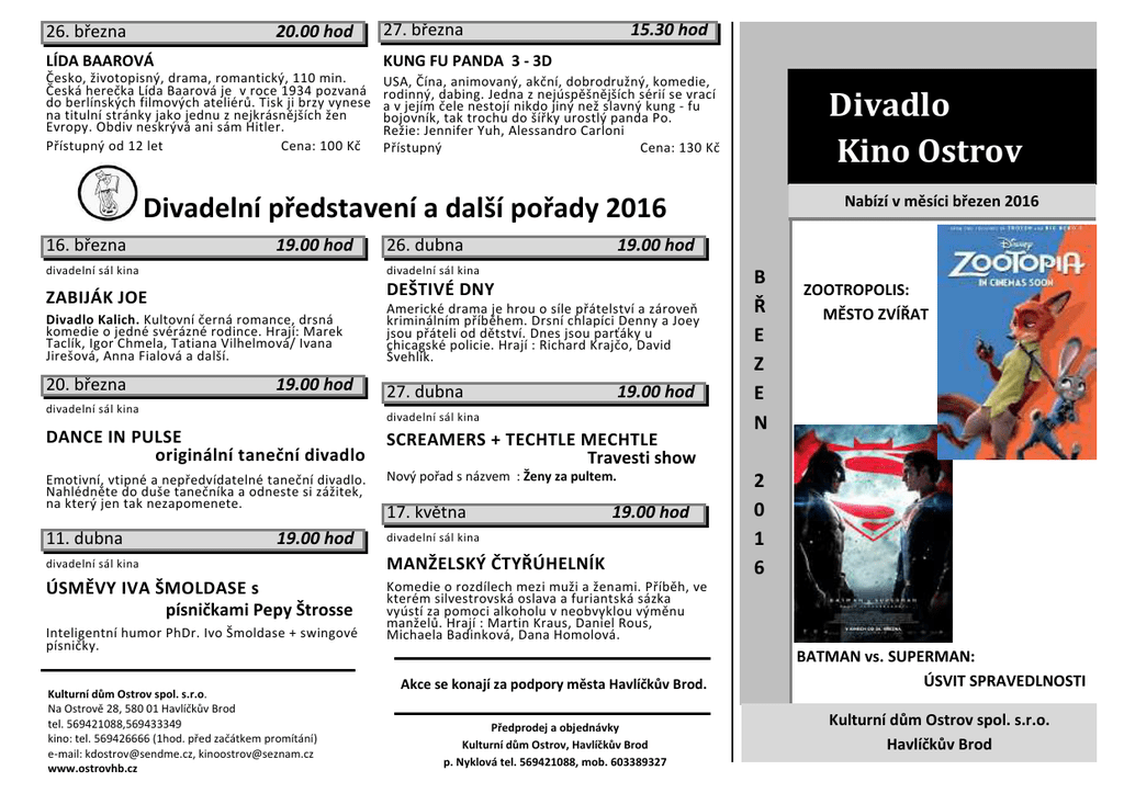 26. března 20.00 hod 27. března 15.30 hod LÍDA BAAROVÁ KUNG FU PANDA 3 - 3D Česko, životopisný, drama, romantický, 110 min. Česká herečka Lída Baarová je v roce 1934 pozvaná do berlínských filmových ateliérů. Tisk ji brzy vynese na titulní stránky jako jednu z nejkrásnějších žen Evropy. Obdiv neskrývá ani sám Hitler. Přístupný od 12 let Cena: 100 Kč USA, Čína, animovaný, akční, dobrodružný, komedie, rodinný, dabing. Jedna z nejúspěšnějších sérií se vrací a v jejím čele nestojí nikdo jiný než slavný kung - fu bojovník, tak trochu do šířky urostlý panda Po. Režie: Jennifer Yuh, Alessandro Carloni Přístupný Cena: 130 Kč Divadlo Kino Ostrov Nabízí v měsíci březen 2016 Divadelní představení a další pořady 2016 16. března 19.00 hod divadelní sál kina 19.00 hod divadelní sál kina DEŠTIVÉ DNY ZABIJÁK JOE Divadlo Kalich. Kultovní černá romance, drsná komedie o jedné svérázné rodince. Hrají: Marek Taclík, Igor Chmela, Tatiana Vilhelmová/ Ivana Jirešová, Anna Fialová a další. 20. března 26. dubna 19.00 hod divadelní sál kina Americké drama je hrou o síle přátelství a zároveň kriminálním příběhem. Drsní chlapíci Denny a Joey jsou přáteli od dětství. Dnes jsou parťáky u chicagské policie. Hrají : Richard Krajčo, David Švehlík. 27. dubna 19.00 hod divadelní sál kina DANCE IN PULSE originální taneční divadlo SCREAMERS + TECHTLE MECHTLE Travesti show Emotivní, vtipné a nepředvídatelné taneční divadlo. Nahlédněte do duše tanečníka a odneste si zážitek, na který jen tak nezapomenete. Nový pořad s názvem : Ženy za pultem. 11. dubna divadelní sál kina 19.00 hod 17. května 19.00 hod divadelní sál kina MANŽELSKÝ ČTYŘÚHELNÍK ÚSMĚVY IVA ŠMOLDASE s písničkami Pepy Štrosse Komedie o rozdílech mezi muži a ženami. Příběh, ve kterém silvestrovská oslava a furiantská sázka vyústí za pomoci alkoholu v neobvyklou výměnu manželů. Hrají : Martin Kraus, Daniel Rous, Michaela Badinková, Dana Homolová. Inteligentní humor PhDr. Ivo Šmoldase + swingové písničky. Kulturní dům Ostrov spol. s.r.o. Na Ostrově 28, 580 01 Havlíčkův Brod tel. 569421088,569433349 kino: tel. 569426666 (1hod. před začátkem promítání) e-mail: [email protected], [email protected] www.ostrovhb.cz Akce se konají za podpory města Havlíčkův Brod. Předprodej a objednávky Kulturní dům Ostrov, Havlíčkův Brod p. Nyklová tel. 569421088, mob. 603389327 B Ř E Z E N ZOOTROPOLIS: MĚSTO ZVÍŘAT 2 0 1 6 BATMAN vs. SUPERMAN: ÚSVIT SPRAVEDLNOSTI Kulturní dům Ostrov spol. s.r.o. Havlíčkův Brod Filmová představení v měsíci březen 2016 4. března 19.00 hod 12. března 17.30 hod 19. března 20.00 hod BOHOVÉ EGYPTA - 3D ŘACHANDA POLEDNICE USA, dobrodružný, fantasy, dabing, cca 127 min. Trůn egyptského vládce obsadil nemilosrdný bůh temnoty Set. Kdysi mírumilovné impérium se kvůli němu zmítá ve válce, chaosu a strachu. Setově krutovládě si troufá vzdorovat jenom hrstka odvážných povstalců. Režie : Alex Proyas. Hrají : Nikolaj CosterWaldau, Gerard Butler, Geoffrey Rush, Brenton Thwaites. Přístupný Cena: 150 Kč Česko, pohádka, 90 min. Pohádka o rozmazlené princezně a dvou kamarádech, kteří se neživí vždycky úplně poctivě. Až když se trojice ocitne shodou okolností v kouzelném Černém lese, kde žijí podivné lesní bytosti, naučí se od nich to, co je nedokázali do té doby naučit sami lidé. Režie : Marta Ferencová Hrají : Bolek Polívka, Josef Rarach, Vilma Cibulková, Oldřich Kaiser, Martin Dejdar, Jan Hrušínský, Vladimír Polívka,Petr Čtvrtníček, Věra Kubánková Přístupný Cena: 110 Kč Česko, horor, 90 min. Eliška se s dcerou vrací do vesnice svého muže. Podaří se Elišce zachránit sebe i dceru před mysteriózním zlem dřív, než ji zcela ovládne stín Polednice Pol a nebo vlastní šílenství? Režie Jiří Sádek Hrají: Aňa Geislerová, Karolína Režie: Lipowská, Daniela Kolářová, Zdeněk Mucha , Jiří Štrébl, Marie Ludvíková Přístupný od 12 let Cena: 120 Kč 12. března RUDÝ KAPITÁN 5. března 17.30 hod ROBINSON CRUSOE : NA OSTROVĚ ZVÍŘÁTEK - 3D Francie, animovaný, dabing, 90 min. Na malém ostrově žije papoušek Úterý ve společnosti svých zvířecích přátel. Jednoho dne najde papoušek na pláži stvoření , které nikdy neviděl : člověka jménem Robinson Crusoe. Režie : Vincent Kesteloot, Ben Stassen Přístupný Cena: 130 Kč 5. března 20.00 hod LÍDA BAAROVÁ Česko, životopisný, drama, romantický, 110 min. Česká herečka Lída Baarová je v roce 1934 pozvaná do berlínských filmových ateliérů. Tisk ji brzy vynese na titulní stránky jako jednu z nejkrásnějších žen Evropy. Obdiv neskrývá ani sám Hitler. Režie: Filip Renč Scénář: Ivan Hubač. Hrají: Táňa Pauhofová, Klára Issová, Simona Stašová, Gedeon Burkhard, Martin Huba, Pavel Kříž, Jiří Mádl, Lenka Vlasáková, Alois Švehlík, Jan Révai Přístupný od 12 let Cena: 110 Kč 20.00 hod DECIBELY LÁSKY Česko,komedie, muzikál, romantický, 100 min. Děj hudební filmové romance se odehrává v současnosti a zachycuje odvěkou touhu po lásce, životním partnerstvím, nápravě křivd i omylů, to napříč všemi generacemi. Režie : Miloslav Halík, Hudba: Michal David Hrají : Rudolf Hrušínský nejml., Ladislav Potměšil, Filip Cíl, Jitka Čvančarová, Lucie Vondráčková, Bolek Polívka, Michal David, Iva Janžurová, Jiří Bartoška Přístupný Cena: 100 Kč 18. března 20.00 hod DVOJNÍCI 24. března 20.00 hod Česko, Slovensko, Polsko, krimi, thriller. Je rok 1992, komunisti padli, ale za jejich zločiny nikoho neodsoudili. V téhle atmosféře se detektiv Krauz dostává k případu umučeného kostelníka, jehož mrtvolu našli s hřebíkem v hlavě. Krauz se i přes varování pouští do pátrání. Režie: Mi