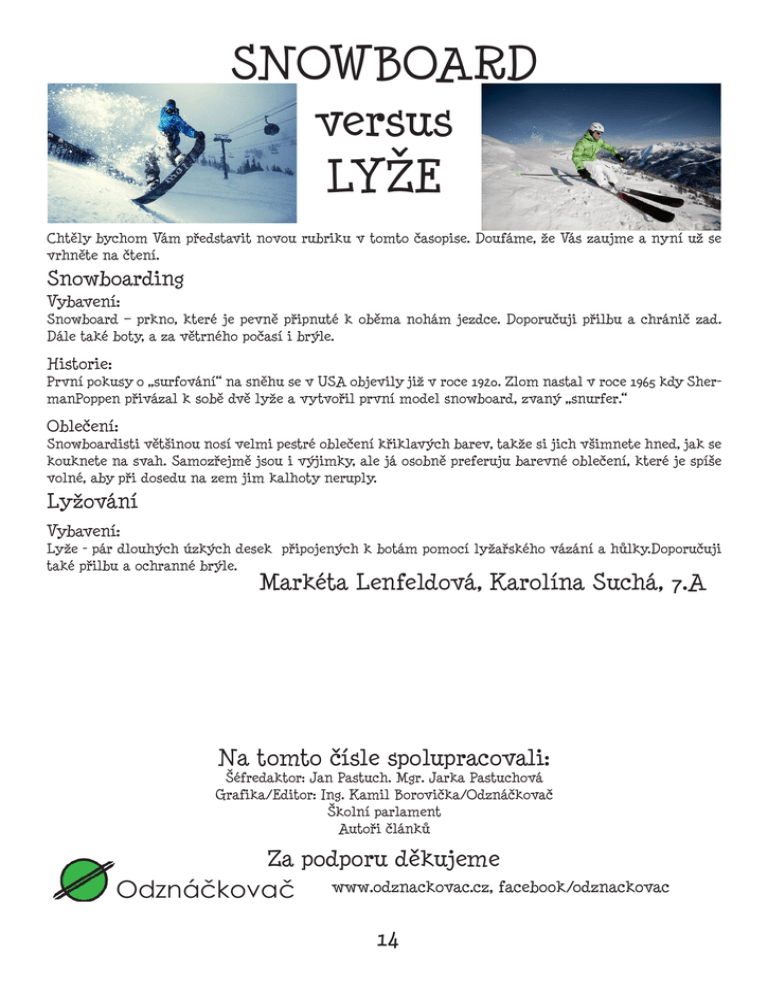 SNOWBOARD versus LYŽE Chtěly bychom Vám představit novou rubriku v tomto časopise. Doufáme, že Vás zaujme a nyní už se vrhněte na čtení. Snowboarding Vybavení: Snowboard – prkno, které je pevně připnuté k oběma nohám jezdce. Doporučuji přilbu a chránič zad. Dále také boty, a za větrného počasí i brýle. Historie: První pokusy o „surfování“ na sněhu se v USA objevily již v roce 1920. Zlom nastal v roce 1965 kdy ShermanPoppen přivázal k sobě dvě lyže a vytvořil první model snowboard, zvaný „snurfer.“ Oblečení: Snowboardisti většinou nosí velmi pestré oblečení křiklavých barev, takže si jich všimnete hned, jak se kouknete na svah. Samozřejmě jsou i výjimky, ale já osobně preferuju barevné oblečení, které je spíše volné, aby při dosedu na zem jim kalhoty neruply. Lyžování Vybavení: Lyže - pár dlouhých úzkých desek připojených k botám pomocí lyžařského vázání a hůlky.Doporučuji také přilbu a ochranné brýle. Markéta Lenfeldová, Karolína Suchá, 7.A Na tomto čísle spolupracovali: Šéfredaktor: Jan Pastuch. Mgr. Jarka Pastuchová Grafika/Editor: Ing. Kamil Borovička/Odznáčkovač Školní parlament Autoři článků Za podporu děkujeme Odznáčkovač www.odznackovac.cz, facebook/odznackovac 14 Školní prádlo 4. číslo 2015 Cena 5,- Kč Adventní úvodní slovo Často vzpomínám na svá dětská léta, vrátím se do školní lavice či někam ven na hřiště. Vybavují se mně barevné obrázky, které vyloudí úsměv, někdy i slzu v očích. Vzpomínám na to krásné. Když se tak někdy toulám krajinou na kole či pěšky, vybaví se mi příběh ze slabikáře Čtyři roční období. Malý kluk v něm odpovídá otci na otázku, které to období má nejraději. Chlapec vždy zmíní právě to, ve kterém se právě nachází. Jaro pro své barvy a květy, léto pro volnost a koupání, podzim mu dává ovoce a barvy listí, v zimě miluje sníh, sáňkování. Vždy mu dávám za pravdu a užívám si nádhery našeho klimatického pásma se všemi obměnami. Moje myšlenky ale povětšinou skončí představou vánočního stromku, blízkosti rodiny a přátel, vůně jehličí i smažené ryby a vánočního cukroví. Čím jsem starší, tím více vnímám, jak čas běží, 365 dní zdaleka není tak dlouhých, jako když jsem byla malá holka, co se nemůže dočkat až zazvoní zvonek a rozzáří se svíčky vánočního stromku. Letos se opět moc těším. Čekají mě trochu jiné Vánoce než v letech minulých, o to s větším očekáváním, ale i trochou obav ukrajuji každý den, pootevírám každé okénko adventního kalendáře, tradičně zahajuji každý nový týden zapálením adventní svíce. Miluji tento čas. Uvědomuji si v něm daleko hlouběji,jak moc jsou pro mě důležití lidé kolem mě, vnímám citlivěji jejich záři a naslouchám jejich hlasu. Vnímat všemi smysly věci je důležité, vnímat tak lidskou bytost se učíme celý život a troufám si říci, že náš čas vymezený k tomu ani nestačí. O to s větší pokorou se skláním ke každé svíci adventního věnce a oceňuji hloubku a nadčasovost myšlenek, které symbolizují památku proroků; záři Betléma; starostlivost pastýře a příchod Ježíše. Své poslání nesou všem nám řadu let a dále ponesou. K tomu mě přiměla pokora k životu a k lidem kolem sebe. Přeji vám všem radostné a pohodové Vánoce. Blanka Reindlová Obsah: Hádanka na červen2 Co nového v devítce3 Zprávy z prvního stupně3 Školní aktuality4 Učitelský sloupek4 Bazar nápadů - Ty p člověka 5 Geocaching5 Vtipy o ...6 Zprávy z parlamentu6 Školní cestománie7 Sport8 Zajímavosti: Vysací zámky8 Drbárna XOXO8 Literární povídka - Poslední knížka 9 Kájin Lifestyle10 Horoskop od Kiky11 Komiks12 Vánoční křížovka13 Snowboard vs Lyže14 Hádanka na červen: Patří ti to, ale tvoji přátelé to používají víc než ty. Co to je? Pokud-li víš odpověď, neváhej a sem s ní ke mně! Hraje se o ceny! Marián 2 9.A. 13 Komiks 12 Co nového v devítce Pro žáky devátých tříd je toto pololetí velmi důležité. Rozhodují se, na jaké školy pošlou své přihlášky. Výběr školy je velmi důležitý a pokud mohu mluvit i za ostatní, velmi složité. Rozhodujeme se už o budoucnosti, o tom jak chceme dál v životě pokračovat. Aby se nám usnadnilo, upřesnilo rozhodnutí, tak jsme dostali nabídku k návštěvě úřadu práce města Liberec. Ten jsme navštívili ……………., kde jsme dostali přednášku od milé paní Prokešové, která nám velmi dobře vysvětlila co, a jak se teď po nás bude chtít. Udělali jsme tam také zájmové testy na počítačích, které nám,nebo aspoň většině, řekli, jaké máme předpoklady. Navazujíc na to si o tom s námi krátce paní Prokešová promluvila. Podle mého názoru, to byla vynikající zkušenost, která nám napomůže se dál rozhodnout. Natálka a Lucka, 9.B Zprávy z prvního stupně IMATRIKULACE Co to je imatrikulace? Je to akce, která se opakuje každý rok. Je to akce, při které se prvňáčci přijímají mezi žáky. Tento rok byli přijati třídy 1.A. pod vedením paní učitelky Hany Tonenové a 1.B. pod vedením paní učitelky Šárky Irové. Prvňáčci nám ukázali,co se za tak krátkou dobu naučili. Zazpívali písničky anglické nebo německém jazyce. Jsou velmi šikovní. Doufám že se jim na škole bude líbit. Kája, 5.A Masáž děti dětem Masáže proběhnou s paní učitelkou Lacinovou ve třídě 5.A . Protože je paní učitelka stále nemocná ještě neproběhly. Masáže budou s lektorkou a budeme se masírovat navzájem se spolužáky/ spolužačkami. Budou místo vyučovacích hodin s paní učitelkou Lacinovou. Výlety Dne 5.11. podnikla 5.B cestu do libereckého podzemí a hned ponich i 5.A. Já jsem jsi pod libereckým podzemí představ