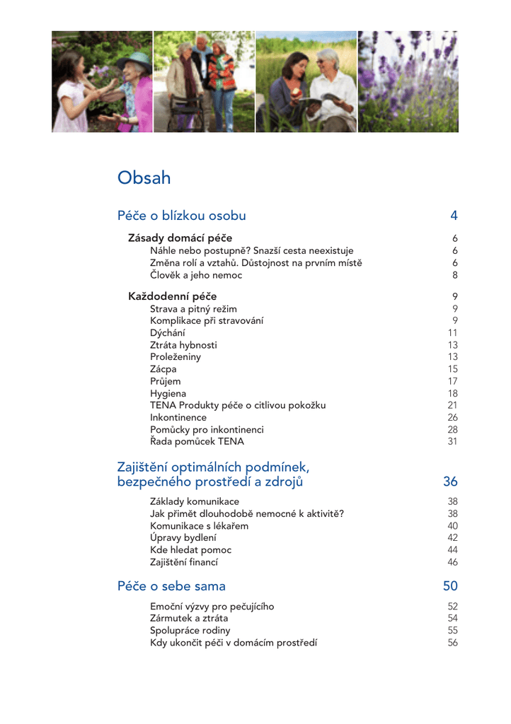 Obsah Péče o blízkou osobu 4 Zásady domácí péče6 Náhle nebo postupně? Snazší cesta neexistuje6 Změna rolí a vztahů. Důstojnost na prvním místě6 Člověk a jeho nemoc8 Každodenní péče9 Strava a pitný režim9 Komplikace při stravování9 Dýchání 11 Ztráta hybnosti13 Proleženiny 13 Zácpa 15 Průjem 17 Hygiena 18 TENA Produkty péče o citlivou pokožku21 Inkontinence26 Pomůcky pro inkontinenci28 Řada pomůcek TENA31 Zajištění optimálních podmínek, bezpečného prostředí a zdrojů Základy komunikace38 Jak přimět dlouhodobě nemocné k aktivitě?38 Komunikace s lékařem40 Úpravy bydlení42 Kde hledat pomoc44 Zajištění financí46 Péče o sebe sama 36 50 Emoční výzvy pro pečujícího52 Zármutek a ztráta54 Spolupráce rodiny55 Kdy ukončit péči v domácím prostředí56 Slovo úvodem Péče o starší dlouhodobě nemocnou blízkou osobu v domácím prostředí je zodpovědný a fyzicky i psychicky náročný závazek. Ve společnosti SCA Hygiene Products si velice vážíme pečujících rodinných příslušníků, a proto jsme iniciovali vznik projektu Jak pečovat. Projekt si klade za cíl dlouhodobě podporovat pečující rodinné příslušníky a přispívat tak k tomu, aby stále více nemocných mohlo co možná nejdéle zůstat v rodinném prostředí. Brožura je určena nejen rodinným příslušníkům, kteří se nově ocitnou v roli pečovatele, ale i těm, kteří již pečují dlouhodobě. Pečující zde naleznou rady a informace, které by jim měly usnadnit jejich péči. Markéta Fornůsková SCA Hygiene Products, s. r. o. Péče o blízkou osobu Zásady domácí péče Každodenní péče Zásady domácí péče „Stalo se to, než bys řekl švec. S manželem rádi houbaříme a klíště jsme čas od času měli, stejně jako všichni. A tak, když jsme přišli domů, nedělali jsme si z těch dvou, co si manžel přinesl domů, těžkou hlavu a vůbec jsme si je nespojili s pozdějšími příznaky, které vypadaly zpočátku spíš jako chřipka. Jinými slovy jsme nemoc absolutně podcenili a já jsem teď nakonec vlastně ráda, že všechno nedopadlo hůř a manžel si jako trvalý následek odnesl „jen“ obrnu horních končetin.“ Kateřina, 42 let Náhle nebo postupně? Snazší cesta neexistuje V zásadě existují dva druhy počátku péče o blízkou osobu. První je naznačen v našem příběhu. Všechno přijde dřív, než si kdokoliv dokáže uvědomit. Stane se nehoda nebo přijde vážná nemoc a následky pak člověk i jeho rodina nesou celý zbytek života. Druhým případem je pozvolný příchod bezmoci a s tím spojená postupná ztráta dříve přirozených schopností. Lidé, kteří musí pečovat o nemocné nebo hendikepované, jsou pak bez rozdílu vystaveni mnohým negativním vlivům: • péče je fyzicky i psychicky namáhavá, • rodinám se často nevyhnou finanční problémy, • pečujícímu se velmi omezí možnost od nemocného odcházet a změní se mu tak zcela rytmus života, • objevují se problémy v práci, • léky a pečovatelské prostředky jsou málokdy dostačující, objevují se pochyby, strach, bezmoc. Tento jednoduchý výčet je navíc jen náznakem skutečnosti a i zdánlivě sebesilnější jedinci svádí každodenní boj s únavou, s dalšími členy rodiny, s nemocným i sami se sebou. „Když manžel začal ztrácet povědomí o světě, najednou se u nás všechno změnilo. Rodinná atmosféra, naše možnosti běžných každodenních činností, ale hlavně vztahy. Do té doby starostlivý člověk, který mně i našim dvěma dcerám pomáhal kde se dalo, radil a byl skutečnou hlavou rodiny, se najednou měnil v nejistého člověka, který nás potřebuje. Hrozně mě to děsilo.“ Marie, 38 let Změna rolí a vztahů. Důstojnost na prvním místě Ještě než začneme podrobněji rozebírat zcela praktické věci péče o člověka, je potřeba alespoň částečně nastínit, že jedním z hlavních prvků péče o nemocného by měla být snaha udržovat jeho důstojnost. Jde dost možná o vůbec nejsložitější zkoušku v celé problematice péče. Pomoc s příjmem potravy, zvládání hygienických nesnází, transport z místa na místo i všechny ostatní podobné činnosti je možné se naučit 6 www.TENACZ.cz a kvalitně vykonávat. Psychická podpora a náš samotný přístup k nemocnému se však naučit nedá. Existuje ale několik pouček, pravidel či rad, jejichž uvědomění vám může tuto nesnadnou otázku pomoci řešit. 1) Při rozhodování o poskytování péče blízkému si položte několik otázek, které vám pomohou ujasnit si, zda a jak o něj pečovat. Navíc vám pomohou vytvořit pečovatelský plán, který odpovídá potřebám vašeho blízkého, ale i vašim a vaší rodiny. Odpovědi na ně ovšem nejsou snadné. • Co příjemce péče potřebuje? • Jaká péče je zapotřebí, aby starý nebo postižený člověk mohl zůstat doma? A má nemocný vůbec doma zůstávat? • Kdo bude poskytovat péči? Kdy? Jak? Pomůže pečovatelská služba? • Lze upravit bydlení tak, aby se zvýšila nezávislost na pečovateli? • Jsou-li zapotřebí vnější služby, má příjemce péče finanční zdroje k jejich zaplacení? Jak je může získat? • Jak je možné poskytnout péči osobě, která ji potřebuje, aniž by byla odmítnuta pozornost jiným (manželovi, dětem), za které pečovatel také nese odpovědnost? 2) Každý člověk má základní lidskou potřebu a právo, aby s ním bylo zacházeno s úctou a respektem a tato potřeba se nemění ani v situaci, kdy člověk zestárne, onemocní nebo se stane postiženým. Ba naopak. Proto především nesmíte sklouznout do role ochranitele a spasitele. • Nerozhodujte za nemocného. Dokud má „zdravou hlavu“, často dokáže vybírat správně. Maximalizujte proto toto jeho privilegium. • Snažte se dívat na svět jeho
